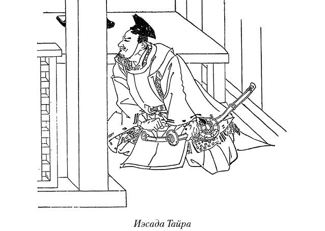Вдобавок вассал его Иэсада, внук Садамицу и сын Иэфусы, тоже родом из Тайра, усевшись во дворе, перед покоем, где справляли праздник, тоже держал меч наготове. Иэсада был в бледно-голубом охотничьем платье, но под одежду надел желтовато-зеленый панцирь, а на боку у него висел большой длинный меч. Главный дворецкий, да и все другие придворные сочли это неслыханным нарушением приличия.