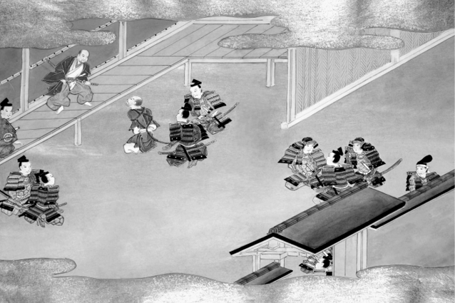 А инок Сайко, едва услышав дурные вести, вскочил на коня и, нахлестывая его, поскакал во весь опор во дворец. Но самураи Тайра догнали его и, преградив путь, закричали: «Срочный вызов из Рокухары! Велено немедленно поворачивать!»