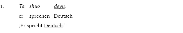 Chinesische Sätze werden in Pinyin-Umschrift angeboten, wobei die Bezeichnung der Töne einfachheitshalber weggelassen wird.1 Als nächstes kommt die Wort-für-Wort Übersetzung und anschließend die Übertragung ins Deutsche. Um dem Leser dieser Arbeit das Erkennen des Zusammenhangs des einzelnen Zeichens zu erleichtern, werden die jeweils fraglichen chinesischen NPn sowie ihre deutsche Entsprechung durch Unterstreichung gekennzeichnet.