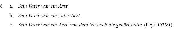 Obwohl die NP ein Arzt in 8a keinen Referenten hat, kann sie durch Adjektive und Relativsätze erweitert werden. Dann denotiert die gesamte NP eine komplexe Eigenschaft.