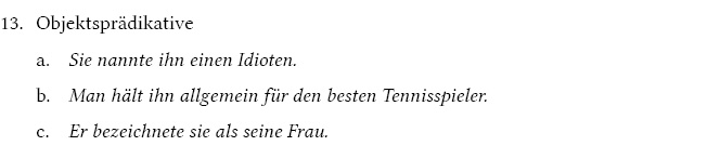 Prädikative NPn treten in Kombination mit Kopula- oder kopulaähnlichen Verben auf. Prädikative, die mit Verben wie sein, werden, heißen, bleiben, gelten als usw. zusammen vorkommen, beziehen sich auf die entsprechenden Subjekte und werden als Subjektsprädikative bezeichnet. Demgegenüber beziehen sich Prädikative, die bei Verben des Benennens, Bezeichnens und Einschätzens auftreten (nennen, heißen, schimpfen, taufen; halten, erklären für; bezeichnen, betrachten, einschätzen, bewerten als usw.), auf die jeweiligen Akkusativobjekte und werden Objektsprädikative genannt (Bausewein 1990:250).