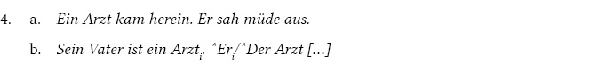 Dieses Kriterium geht davon aus, dass qualitative NPn keine Existenz von Referenten präsupponieren. Deswegen kann zu ihnen keine anaphorische Verbindung hergestellt werden. Die NP ein Arzt in 4b dient nicht dazu, einen neuen Referenten in den Diskurs einzuführen, sondern dazu, einen schon in den Diskurs eingeführten Referenten (sein Vater) näher zu bestimmen. Bei der Anwendung dieses Kriteriums sind zwei Aspekte besonders zu beachten: Erstens soll festgestellt werden, ob zwischen zwei NPn tatsächlich Koreferenz besteht: