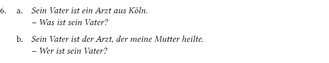 Lambrecht (1994) betrachtet die NP Arzt im Antwortsatz als referentiell, wofür er zwei Argumente anführt: Zum einen ist die NP „an anaphoric topic expression“, zum anderen kann die NP durch das Demonstrativpronomen das ersetzt werden. Dagegen ist kritisch einzuwenden, dass direkte Anaphorik nicht auf Formidentität, sondern auf Referenzidentität beruht. Bei 5 geht es darum, ob „er“ die Eigenschaft „als Arzt tätig sein“ besitzt. Mit der NP Arzt wird kein neuer Referent in den Diskurs eingeführt. Außerdem werden referentielle NPn im Deutschen je nach Genus pronominalisiert. Um auf eine maskuline NP im Singular Bezug zu nehmen, sollte das Pronomen der verwendet werden, nicht aber das neutrale das. Im Gegensatz dazu können artikelose NPn und Adjektive, die als Prädikativ fungieren, nur durch neutrale Pronomen (es/das/dies) ersetzt werden. Zweitens stellt die anaphorische Zugänglichkeit eine hinreichende, jedoch keine notwendige Bedingung für Referenzidentität dar: NPn, die anaphorisch aufgreifbar sind, sind referentiell. Umgekehrt gilt aber nicht: NPn, die referentiell sind, sind nicht immer anaphorisch zugänglich. Beispielsweise kann eine nicht-spezifische NP nicht mit einem Pronomen wieder aufgenommen werden, außer wenn das Pronomen in einem modalen Kontext steht (s. Abschnitt 2.2).