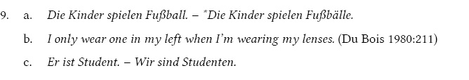 Qualitative NPn denotieren Eigenschaften und können deswegen nicht gezählt werden (9a, b). Aber wenn sie als Prädikativ fungieren, müssen sie in der Regel in Numerus mit zusammenhängenden NPn kongruieren (9c).