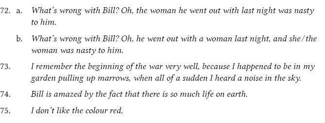 Der Relativsatz in 72a etabliert einen definiten Referenten für den Hörer, obwohl der Referent vorher nicht erwähnt ist. Etablierende Relativsätze sind vor allem durch drei Eigenschaften gekennzeichnet: Erstens lässt sich 72a in 72b umwandeln, wobei die beiden pragmatisch äquivalent sind. Zweitens verknüpfen etablierende Relativsätze neue, unbekannte Referenten entweder mit Objekten im vorangehenden Diskurs oder mit Sprechaktteilnehmern, oder sie identifizieren Objekte in der unmittelbaren Sprechsituation. In 72a wird der neue Referent z.B. mit einem bereits erwähnten Objekt, nämlich Bill, in Verbindung gesetzt. Drittens, wenn der Relativsatz weggelassen wird, ist die Referenz der NP nicht eindeutig. NPn mit genitivischem Attribut charakterisieren sich dadurch, dass zwischen dem Kopfnomen und dem nominalen Attribut ein Assoziationsverhältnis besteht. Zum Beispiel enthält die NP the beginning of the war in 73 sowohl den Auslöser als auch das Produkt der Assoziation. Für eine erfolgreiche Referenz spielt das Genitivattribut eine entscheidende Rolle, weil es den Rahmen setzt, in dem der Referent der definiten NP identifiziert werden soll. Bei NPn mit Komplementsatz oder mit Apposition erklärt der Komplementsatz oder die Apposition die NP weitgehend und ermöglicht die Identifizierung ihres Referenten.