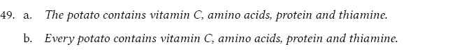 Allquantifizierte NPn sollten nicht als generisch betrachtet werden, weil sie keine Ausnahme zulassen. Wenn auch nur eine Kartoffel kein Vitamin C enthält, ist 49a immer noch wahr, 49b dagegen falsch.