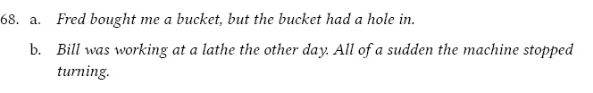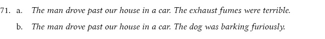Bei 71a ist es einfach, eine assoziative Beziehung zwischen den beiden NPn herzustellen, weil es zum Allgemeinwissen gehört, dass ein Auto einen Auspuff hat. Dagegen sind car und dog in 71b nicht direkt miteinander assoziiert. Die Verwendung des definiten Artikels ist nur dann gelungen, wenn der Hörer weiß, dass es einen Hund gibt, der vorbeifahrende Autos anbellt. Das heißt, dass bei 71b spezifisches, von Sprecher und Hörer geteiltes Wissen erforderlich ist, um eine Assoziation herzustellen.