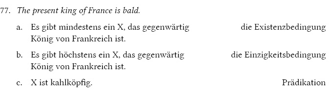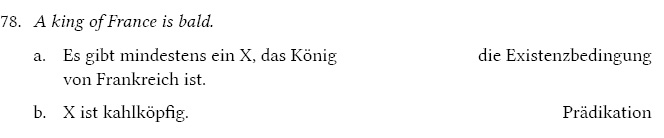 Nach Russell ist das deskriptive Material der definiten Kennzeichnungen allein maßgebend für die Eindeutigkeit der Referenz. Als Beispiel verwendet er ausschließlich definite NPn, deren deskriptiver Gehalt auf ein einziges Objekt zutrifft, wie z.B. the father of Charles II., the king of France, the author of Waverley usw. Die Kontextabhängigkeit natürlicher Sprache wird aus seiner Untersuchung ausgeschlossen.