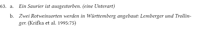 Es ist darauf hinzuweisen, dass bloße Plurale nur mit einigen Artenprädikaten kompatibel sind. NPn mit indefinitem Artikel lassen sich nur dann als artreferierend interpretieren, wenn sie taxonomisch verwendet werden (63a). Außerdem können Nomen mit dem Suffix -art oder -sorte Unterarten bezeichnen (63b).