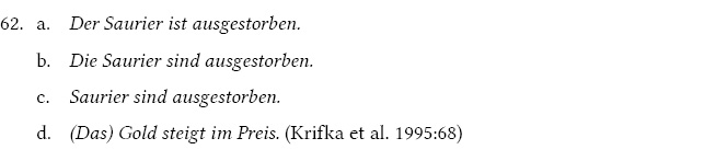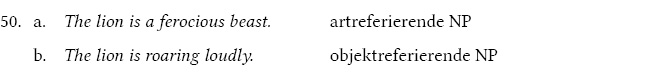 In Krifka et al. 1995 wird zwischen zwei Phänomen von NPn unterschieden, die als generisch bezeichnet werden, nämlich generische NPn (auch artreferierende NPn) (48a, c-f) und generische Sätze (auch charakterisierende Sätze) (48b). Generische NPn referieren auf Arten und werden den NPn gegenübergestellt, die auf Objekte referieren (objektreferierenden NPn).