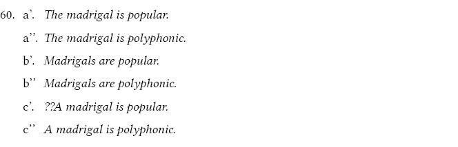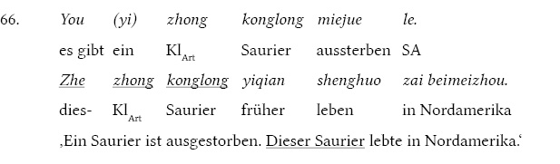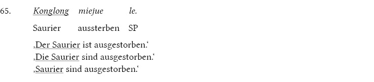 Im Chinesischen haben generische NPn eine einheitliche Form: Nur bloße NPn können auf Arten referieren (außer den taxonomisch verwendeten NPn).1 Zum Beispiel entsprechen 62a, b, c im Chinesischen 65: