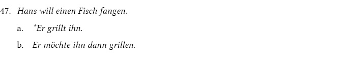 Dagegen zeigt die Verwendung des indefiniten Artikels lediglich an, dass ein Objekt existiert, auf die die Beschreibung der NP zutrifft (nur die Existenzbedingung):
