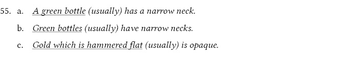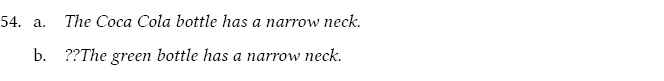Dass die NP the green bottle in 54b nur als objektreferierend interpretiert werden kann, lässt sich dadurch erklären, dass es für Cola-Flaschen eine bereits etablierte Gattung gibt, für grüne Flaschen jedoch nicht. Außerdem lässt sich mit diesem Test zeigen, dass artikellose NPn auch eine objektreferierende Lesart haben können, auch wenn sie in charakterisierenden Sätzen stehen. In 53b, c sind sie artreferierend, in 55b, c dagegen objektreferierend: