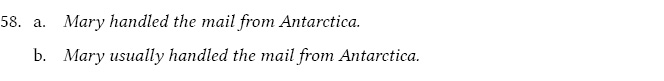 Wenn mit 58a gemeint wird, dass Mary generell für die Post aus der Antarktis zuständig ist, bringt die Hinzufügung des Adverbs nur eine leichte Bedeutungsveränderung mit sich. Aber 58a kann auch bedeuten, dass Mary bestimmte Briefe aus Antarktis erledigt, dann wird die Bedeutung durch das Adverb wesentlich verändert. Im ersten Fall handelt es sich um einen charakterisierenden Satz, im letzten um einen partikulären. Zweitens: Charakterisierende Sätze drücken Regelmäßigkeiten aus und berichten nicht über spezielle Ereignisse. Sie sind typisch statisch, während partikuläre Sätze oft nicht statisch sind.