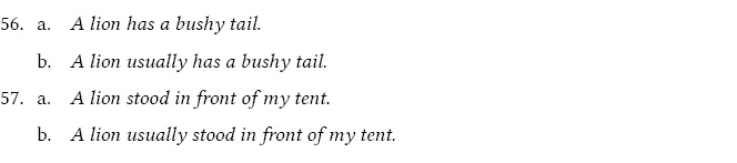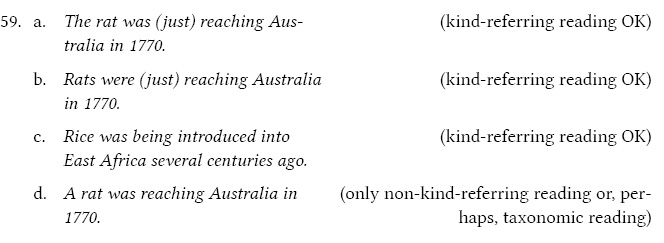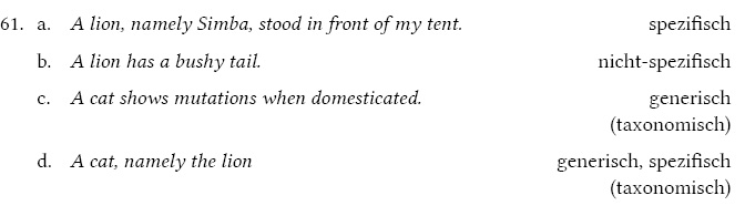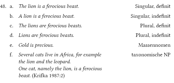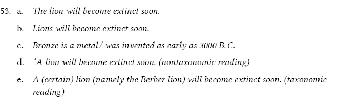 Aus 53 ist ersichtlich, dass NPn mit definitem Artikel im Singular (53a), artikellose NPn im Plural und im Singular (53b und c) mit be extinct kompatibel sind, während NPn mit indefinitem Artikel im Singular nicht akzeptabel (53d) sind, außer wenn sie sich auf eine Unterart beziehen (53e). Außerdem ist darauf hinzuweisen, dass artikellose Plurale ambig sind: Sie können auf Arten referieren, aber die definite Form the lion ist bevorzugt. Oft werden sie als objektreferierend analysiert. Zum anderen müssen artreferierende NPn semantisch mit einer konzeptuell bereits etablierten Gattung verbunden sein, auf die sie referieren:
