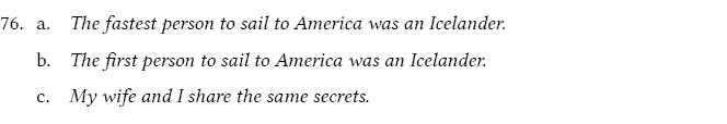 Zu den semantisch vereindeutigenden Adjektiven (engl. ‚unexplanatory‘ modifiers) gehören zum Beispiel same, identical, next, other, only usw. NPn, die solche Modifikatoren enthalten, müssen als definit markiert werden, obwohl ihre Referenten nicht vorerwähnt sind.