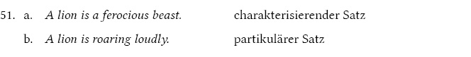 Außerdem ist zu bemerken, dass artreferierende NPn in charakterisierenden Sätzen auftreten können, z.B. 50a. Dabei drückt der Satz Regelmäßigkeiten aus, die für eine bestimmte Art gelten. Im Folgenden werden einige Tests vorgestellt, die dazu dienen, artreferierende NPn von objektreferierenden sowie charakterisierende Sätze von partikulären zu unterscheiden.