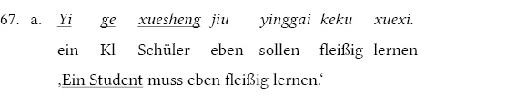 Bei 67 a und b handelt es sich um charakterisierende Sätze. Die unterstrichenen NPn stehen in der Form yi+Kl+N, wobei das Numerale yi nicht akzentuiert werden darf und der Akzent auf das Kernnomen fällt. Nach D.-Q. Liu (2002:419) charakterisiert sich yi+Kl+N mit „generischer“ Lesart durch zwei Eigenschaften: Zum einen kann hinter yi+Kl+N, das am Satzanfang steht, ein Topikmarker wie me, a, ne usw. angefügt werden; zum anderen bleibt die Bedeutung des Satzes unverändert, wenn yi+Kl weggelassen wird. In dieser Arbeit werden NPn wie die in 67a und b nicht als an sich generisch, sondern als nicht-spezifisch betrachtet, weil sie sich auf kein bestimmtes Individuum beziehen, sondern auf ein prototypisches Exemplar einer Art referieren.