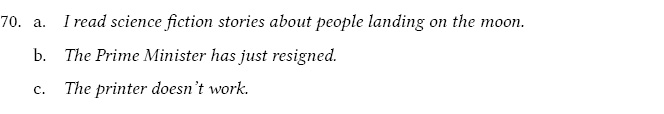 Es ist allgemein bekannt, dass es für die Erde nur einen Mond gibt. Deswegen kann jeder wissen, worauf sich die NP the moon bezieht. Dagegen setzt 70b Wissen voraus, das allen Mitgliedern einer Gemeinschaft zugänglich ist. Zwei Engländer, die sich vorher nie getroffen haben, können von the Prime Minister reden, ohne dass Kommunikationsprobleme auftreten. Bei 70c müssen die Sprechaktteilnehmer ganz spezifisches Wissen teilen, zum Beispiel sitzen sie im selben Büro und wissen genau, dass es da nur einen Drucker gibt.
