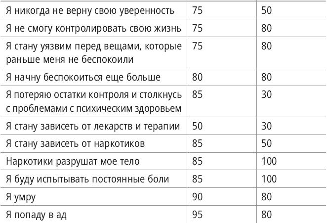 В приведенной ниже таблице (адаптированной из работы Майкла Вейзи и Томаса Борковца) показан еще один пример индивидуальной реакции высокобеспокойного человека на «катастрофическое интервью». На этот раз темой для беспокойства является то, что волнует большинство людей на определенном этапе жизни, – школьные оценки. Авторы исследования попросили участников оценить чувство напряжения в момент интервью (первая колонка, по шкале от 0 до 100, где 0 – совсем не расстроен, а 100 – очень расстроен) и вероятность, с которой, по их мнению, мысль действительно воплотится в жизнь (вторая колонка, по шкале от 0 до 100, где 0 – вряд ли произойдет вообще, а 100 – обязательно произойдет).