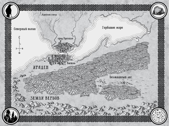 В нашу первую встречу ты выехал из леса, миновал высокие пучеглазые жертвенные столбы, отмечавшие лесную границу; твоя лошадь передвигалась шагом. Подле держался в седле небезызвестный мне Мават, высокий, широкоплечий; десятки длинных кос перехвачены сзади ободом с перьями золотой чеканки, темно-серый плащ подбит синим шелком. На предплечьях мерцают золотые обручи. Он рассеянно улыбался, что-то говорил тебе, однако взгляд его был прикован к крепости Вастаи на крохотном полуострове в двенадцати милях впереди – двух- и трехэтажным постройкам, окруженным бледно-желтой стеной из известняка, чьи края смыкались на круглой башне у самого моря. По ее сухопутную сторону раскинулся городок, обнесенный земляным валом. Чайки носились над голыми мачтами редких кораблей в порту, над серыми волнами с барашками пены и белеющими вдали парусами. Через пролив едва виднелись белокаменные здания и многочисленные корабли града Вускции.