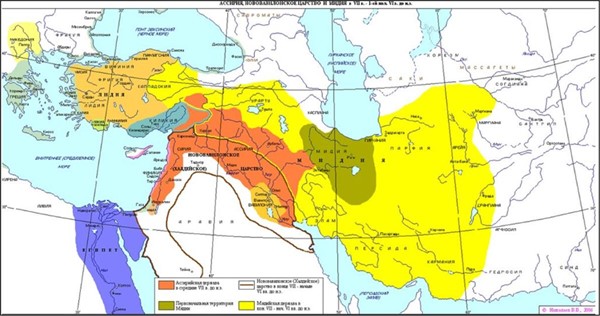 По-видимому, все они возлагали надежды на назревавший конфликт между Мидией и Вавилонией. Но Мидия до 590 г. до н. э. была занята ликвидацией Урартского и Скифского царств, а после этого оказалась вовлеченной в длительную войну с Лидией. В 587 г. до н. э. Навуходоносор II вновь появился в Сирии, Априй отступил, оставив Иудею на произвол судьбы. После полуторагодичной осады Иерусалима Цидкия попался вавилонянам во время неудачной вылазки. Ему выкололи глаза и отправили в Вавилонию. В 586 г. до н. э. Иерусалим был взят, разрушен и ограблен. Значительная часть населения, в первую очередь знать и ремесленники, была переселена в Вавилонию. Земли переселенных раздали оставшимся жителям. Последние иудейские бойцы отошли с женами и детьми на египетскую территорию. Длительная осада Тира не дала Навуходоносору II решительных результатов. В 597 г. до н. э. пришли к компромиссу: царь Тира Итобаал III признал верховенство Навуходоносора II, но Тир сохранил самоуправление. Заиорданские царства признали власть Вавилонии и расширили свои владения за счет Иудеи. Столица Навуходоносора II вновь стала ведущим городом Ближнего Востока, процветающим и многонациональным. Навуходоносор, называемый в Библии «царем халдеев», был женат на Амитис – дочери Мидийского царя Киаксара, для которой он приказал построить знаменитые «висячие сады Семирамиды», называемые древними греками одним из семи «чудес света»; название садов ошибочно закрепилось за ассирийской царицей Семирамидой, жившей двумя веками ранее.