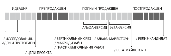 Когда я пришел в игровую индустрию, вся наша деятельность и процессы все еще находились в зачаточном состоянии. Мы сделали все возможное, чтобы структурировать нашу работу, но допустили немало ошибок. Шло время, этап за этапом мы сначала выяснили важность этапа препродакшена и его отличие от полного продакшена, а затем осознали значимость этапа постпродакшена. Наконец, мы поняли, что упустили самый первый шаг: нам стоило перенять некоторые процессы формирования идей, которые используются в академических игровых дисциплинах и в других, более зрелых, сферах дизайна. Эти четыре этапа проекта – формирование идеи, препродакшен, полный продакшен и постпродакшен – послужат нам столь необходимыми ориентирами, чтобы проложить путь от самых первых набросков до готовой игры. Вы можете видеть их на рис. 0.1.