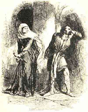 С кинжалом в руках он тихо прокрался в темную комнату, где спал Дункан. Макбет уже замахнулся на короля, но вдруг увидел, как в воздухе сверкнул другой кинжал с окровавленным клинком, направленный на Макбета… Когда же он хотел схватить появившийся кинжал, то оказалось, что ничего не было, – это только померещилось напряженному и расстроенному воображению Макбета.