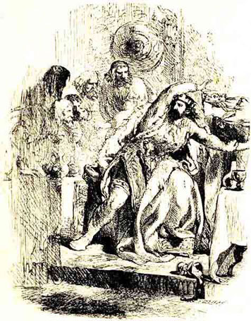 Но Макбет продолжал стоять неподвижно и смотрел на пустое кресло, где видел призрак Банко. Он даже обратился к призраку с несколькими несвязными словами, и слова эти были так странны, что королева испугалась, как бы не обнаружилась страшная тайна. Поэтому она извинилась перед гостями, говоря, что у короля бывают такие припадки, и попросила гостей разойтись.