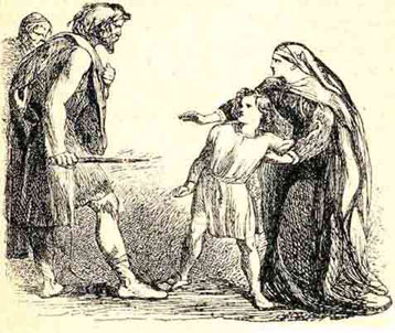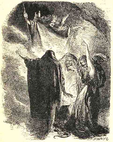 Ведьмы спросили Макбета, от кого он желает получить ответ: от них или непосредственно от старших духов? Макбет, не проявивший ни малейшего страха во время этих отвратительных приготовлений, совершавшихся тут же у него на глазах, смело сказал: «Кто они такие? Покажите мне их!» Тогда перед ним поочередно появились три призрака.