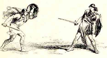 Макбет, рука которого была уже достаточно обагрена кровью, все еще надеялся избегнуть поединка. Но Макдуфф продолжал вести себя вызывающим образом, называл Макбета тираном, убийцей, исчадием ада.