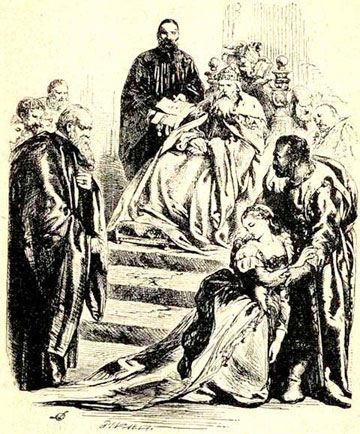 Старому сенатору нечего было возражать на это, он подозвал Отелло и с грустью уступил ему свою дочь, которая и без того уже больше не принадлежала отцу. Но тут же Брабанцио прибавил, что если бы это было в его власти, он никогда не выдал бы свою дочь за мавра Отелло, и выразил радость, что у него нет другой дочери. Ведь поведение Дездемоны научило бы его быть тираном и держать взаперти дочерей.