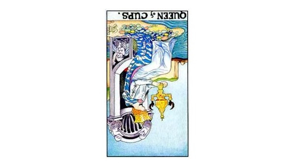 Перед Вами, словно наполненная магическим светом, лежит выпавшая Вам перевернутая карта Таро «Королева кубков».
