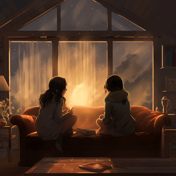 Май и Алиса собрались вместе в уютной гостиной, чтобы обсудить, что они могут сделать для возвращения радуги в свой город. Дождь за окном стучал, создавая ритмичный фон для их разговора.