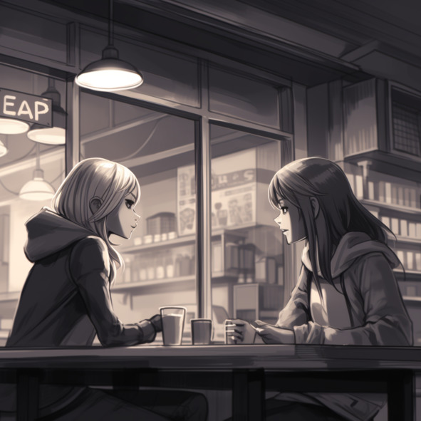 Войдя в уютное кафе, девушки заметили группу людей за столиком, обсуждающих что-то с живым интересом. Май и Алиса решили подойти и спросить, в чем дело.