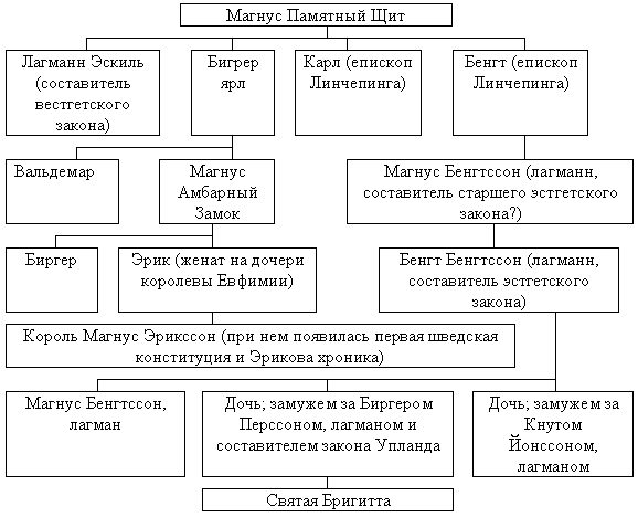 Письменная культура, существовавшая вне церкви, создавалась очень небольшим кругом знати при королевском дворе. Ниже изображено генеалогическое древо, которое свидетельствует о том, что наиболее известные литературные произведения XIII–XIV веков создавались членами самого знатного рода в стране, который ошибочно назван династией Фолькунгов.