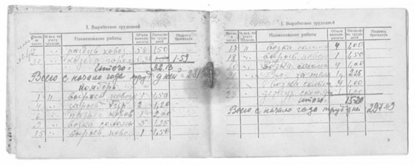 Я дояркой вырабатывала по 300 трудодней, этого мне хватало. А те, которы на поле спинушку гнули от зари до зари, ишшо35 меньше получали трудодней—то. По сто может. Только-только по норме отчитывались. Да, не дай Бог, если меньше выполнишь, из коухоза исключат, усадьбу отымут и сенокос, а то и засудят. На трудодни давали хлеб да дрова. Да и те неколкие, комли36одне. Но только всего один год на трудодни нам дали вдосталь хлеба. А потом вообще ничево не давали. Задаром работали. Все, што выростили сдавали государству. Да зимами ишшо и лес заготовляли. Для кого эти заготовки мы делали, ня знаю. Сказали делать, мы и делали. Тогда лишнего люди не спрашивали. Опасно было вопросы—то задавать.