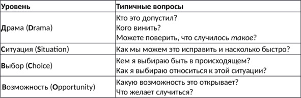 На уровне Драмы вероятность научиться чему-либо столь же мала, сколь готовность брать на себя ответственность. Источник влияния, силы, принятия решений воспринимается как находящийся вовне, что снижает нашу способность к изменению, поскольку мы, по сути, оказываемся жертвами обстоятельств. По мере перехода на уровень Ситуации происходит значительное увеличение доступных лично нам сил, и поэтому коучинг начинается именно здесь. На этом уровне уже возможны обучение и рост. Мы понимаем нашу способность к нахождению решения, к улучшению или достижению, и видим ценность в признании своей роли и в ситуации, и в ее разрешении. Здесь мы способны спрашивать следующее: