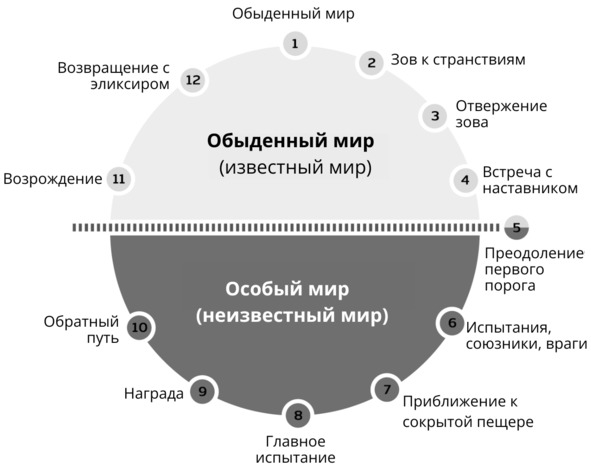 Одна из наиболее значимых работ по нарративам путешествия – книга американского автора Джозефа Кэмпбелла «Тысячеликий герой» (The Hero with a Thousand Faces). Кэмпбелл разбивает это путешествие на последовательность этапов, через которые проходит почти любой герой (мифов, включающих все этапы, немного: некоторые содержат значительную часть, другие – лишь несколько), и далее разделяет эти этапы на три категории: исход, инициацию и возвращение. «Исход» относится к предыстории, к тому, как развивалась жизнь героя до его отправления на поиски. «Инициация» рассказывает о том, что происходило с героем в ходе его приключений. Наконец, «Возвращение» описывает героя, прошедшего трансформацию суровыми испытаниями, которые ему пришлось преодолеть, и теперь возвращающегося в свой изначальный мир.
