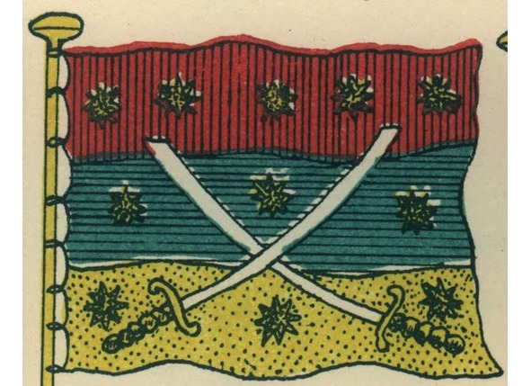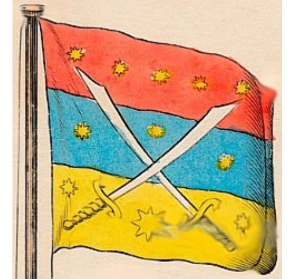 1885 г. датируется и другой флаг армянской диаспоры, состоящий из равных горизонтальных красной, синей и желтой полос.