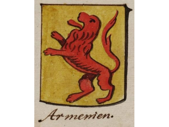 Первый герб Армении – вздыбленный красный лев в золотом поле можно найти в сборнике Геррита Хесмана, изданном в 1708 г.