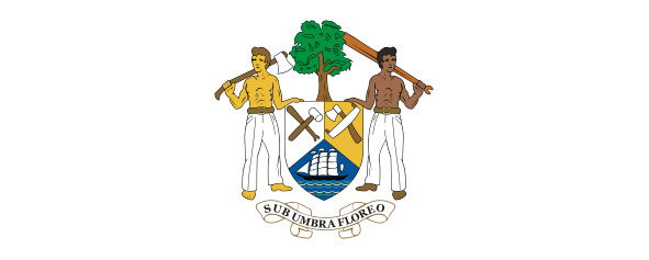 Щитодержателями являются розовый фламинго (слева) и голубой мерлин – типичные представители фауны страны и океана; их подножия – зеленая растительность болотистых заводей (места обитания фламинго) и голубые воды океана с серебряными барашками волн.