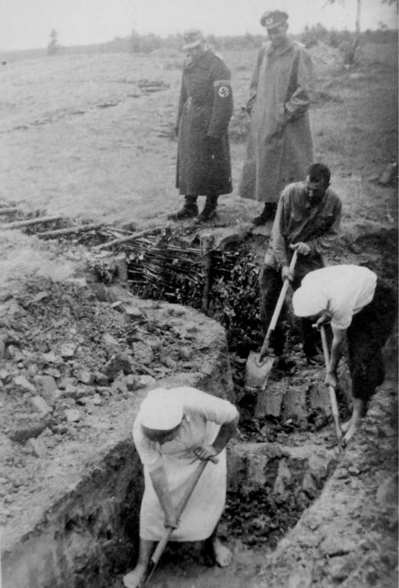 Женщины оккупированной Беларуси работают на немецкой оборонительной линии, за ними наблюдает сотрудник немецкой военно-строительной организации (Organisation Todt). Оперативный сектор немецкой 3-й танковой армии (3. Panzerarmee), 1944 г. Источник: «Verbrechen der Wehrmacht. Dimensionen des Vernichtungskrieges 1941—1944». Hamburger Edition, 2012. Автор фото: Йоганнес Бергман (Johannes Bergmann).