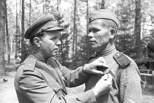 Командир 399 сд генерал-майор Д.В.Казакевич прикрепляет Орден Славы III ст. командиру пулеметного расчета 1345 сп старшему сержанту Василию Матвеевичу Матросову (1902 г.р.), отличившемуся при освобождении Чаусского района в марте 1944 г. Июнь 1944 г.