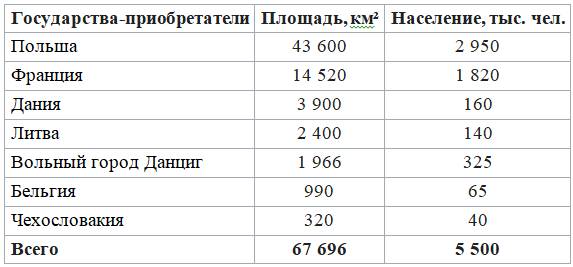 К новообразованной Польше отходили Позен (Познань), части Померании (Поморья) и ряд других территорий Западной Пруссии; Данциг (Гданьск) и его округ был объявлен «вольным городом» Лиги Наций. Он включался в польскую таможенную систему. Польша получала контроль над железнодорожными и речными путями Данцигского коридора. Регион Мемельланд (Мемельская область) был передан под управление держав-победительниц (в феврале 1923 года был присоединён к Литве). К Чехословакии отошёл небольшой участок территории Верхней Силезии – Глучинская область.