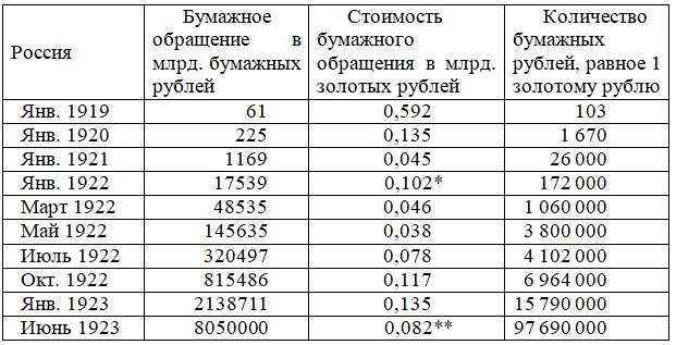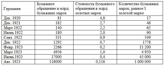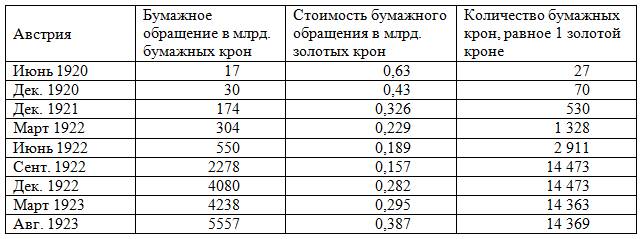 «Таблицы прежде всего показывают, как быстро в период крушения денежного обращения степень обесценения денег обгоняет рост бумажного обращения. В период крушения германской марки, начиная с декабря 1920, степень обесценения германской марки временами в 2 раза превышала размер прироста денежного обращения. В июне 1923 стоимость бумажных денег упала по сравнению с декабрем 1920 в 2500 раз, тогда как бумажное обращение увеличилось только в 200 раз. Цифры, приведенные для Австрии, касаются более поздней стадии разрушения денежной системы. Но если данные для Австрии на июнь 1920 и сентябрь 1923, то соотношение будет аналогично Германским. Данные о России в общем подтверждают те же основные черты.» [1, c. 115]