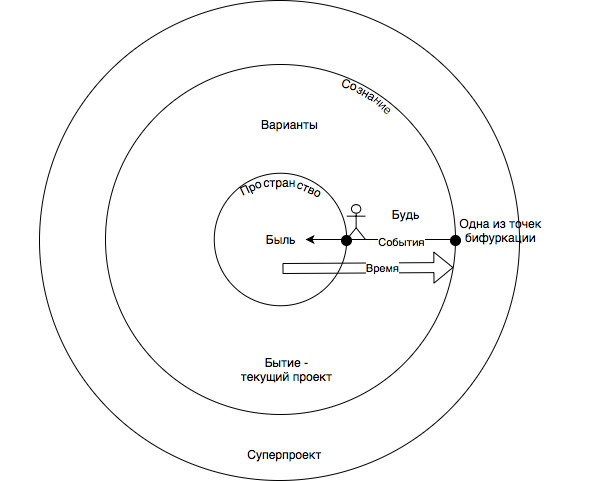 События, реализуясь, преобразуют Будь в Быль и фиксируют её в Пространстве, пока Быль не дойдёт до границ Бытия, т.е., до точки бифуркации и, соответственно, перехода количества в качество, открыв себя, как новый проект с новыми границами Бытия.