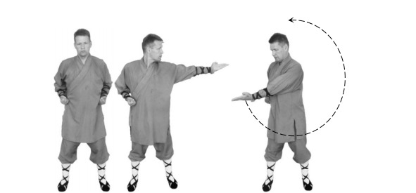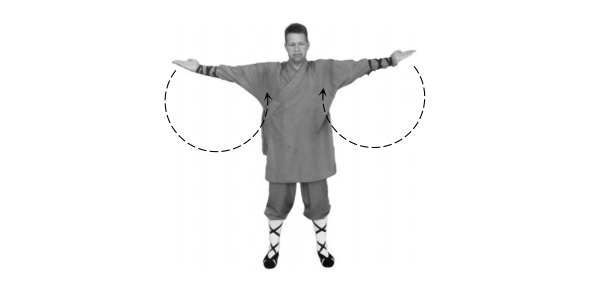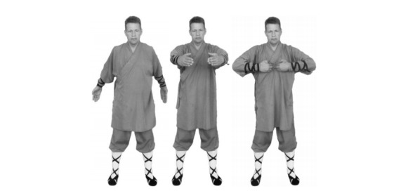 Встать ровно, плечи расслаблены, ноги в коленях слегка согнуть. На вдохе руками от положения возле «даньтянь» начать медленное движение немного назад и вывести по кругу вперед, центры ладоней направлены во внутрь. На короткое время сконцентрировать внимание на точке «лаогун» (центр ладоней). Продолжить вдох и поднести ладони к груди, сделать несильное надавливание средними пальцами рук на точку «таньчжун». На выдохе начать выпрямление рук по кругу вверх, используя локти как центр вращения, и опустить в стороны до уровня плеч. Выдох выполнять через рот, сложить губы «трубочкой». Медленно и беззвучно выполнять выдох с звуком «ту». В конце фазы движения руки выпрямить в локтях, ладони развернуть центрами вверх. Центр тяжести перенести вперед на носки, взгляд направлен вперед. Сконцентрировать внимание на точке «иньтан».
