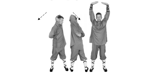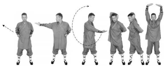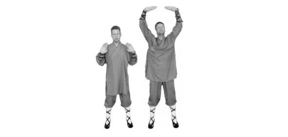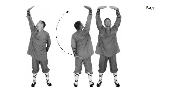 Встать ровно, плечи расслабить, ноги в коленях слегка согнуть, руки опустить вдоль тела, расстояние между пятками – приблизительно 10 см, между носками – 15 см. Нижнее дыхание, смотреть вперед. На вдохе медленно поднять руки вверх перед собой, центр ладоней направлены вверх. Над головой руки остановить, локти слегка согнуты, взгляд направлен вверх на ладони. Сразу на выдохе ладони медленно опустить вниз и сложить их вместе у живота (нижний «даньтянь», область пупка). Руки слегка согнуты в локтях, центры ладоней направлены вверх. В этом положении оставаться около 1 мин, сконцентрировать внимание на нижнем «даньтянь», вдох и выдох делать через нос, при этом язык прижать к верхнему небу («да цяо» – «построение моста»). При вдохе «ци» мысленно опустить вниз по переднесрединному меридиану «жень—май» к точке «хуэйинь» (между ногами), при выдохе «ци» поднимается далее по позвоночнику вверх до точки «байхуэй» (темя) и опускается до носа и доходит до моста «да цяо» (верхнее небо).