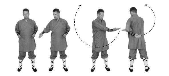 На выдохе опустите пятки после предыдущего упражнения на землю, одновременно опустите ладони через стороны вниз. Ладони сжать в кулаки и прижать к бедрам, центры кулаков направлены вверх, смотреть вперед. Медленно вдыхая, раскройте кулаки в ладони. Продолжая вдох, правую ладонь отведите влево на уровне живота (центр ладони направлен вниз), левую ладонь заведите за спину и прижмите тыльной стороной к пояснице, смотрите на правую ладонь. Продолжая вдох, сделайте правой ладонью движение слева направо вверх по дуге до положения над головой. Медленно выдыхая, посмотреть на правую ладонь. Одновременно левой ладонью сделать давящее движение вниз. Сконцентрируйте внимание на точке «лаогун» (центр ладони). Вдыхая, медленно поднимите левую ладонь через сторону вверх и поднесите к правой, смотреть на ладони. Выдыхая, опустите руки через стороны вниз, ладони сжать в кулаки и поднести к бедрам. Вдыхая, раскрыть кулаки в ладони. Продолжая вдох, левую ладонь отведите вправо на уровне живота (центр ладони направлен вниз), правую ладонь заведите за спину и прижмите тыльной стороной к пояснице, смотрите на левую ладонь. Продолжая вдох, сделайте левой ладонью движение справа налево вверх по дуге до положения над головой. Медленно выдыхая, посмотреть на левую ладонь. Одновременно правой ладонью сделать давящее движение вниз. Сконцентрируйте внимание на точке «лаогун». Вдыхая, медленно поднять правую ладонь через сторону вверх к левой, смотреть на ладони. Выдыхая, опустите руки через стороны вниз.